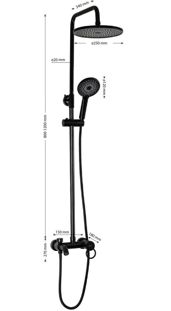 Габаритные размеры: ширина смесителя 150 мм, высота 100 мм, длина излива корпуса 180 мм, высота стойки 800*1200 мм, длина излива стойки 340 мм, круглая душевая лейка d = 120 мм, круглая лейка тропический душ d = 250 мм, шланг 150 см.