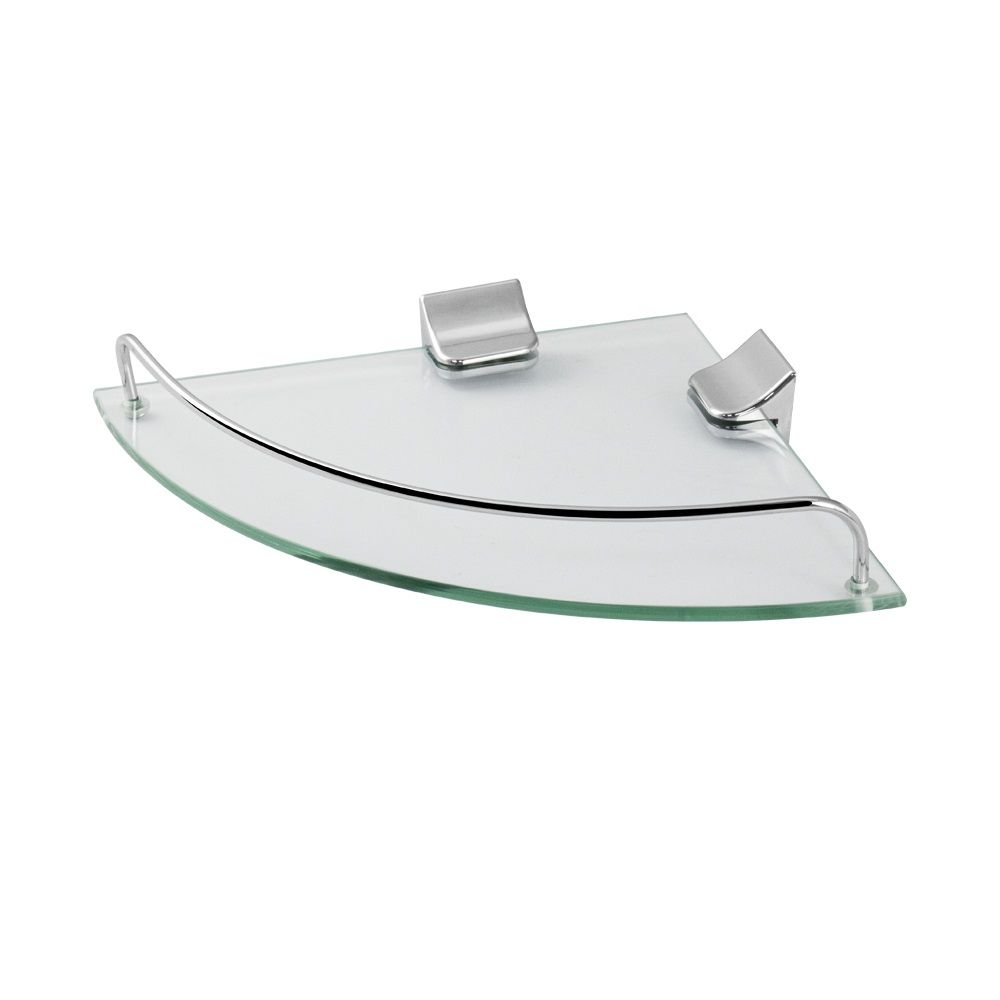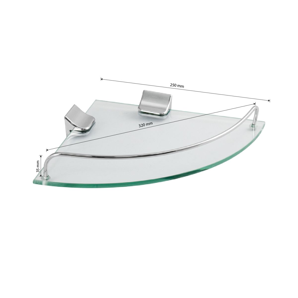 Подвесная однаэтажная угловая полка для ванной, из прочного стекла, толщиной 5 мм с полированными краями о которые невозможно порезаться, с надежной фиксацией к стене с помощью крепления из металла, с хромированным покрытием.