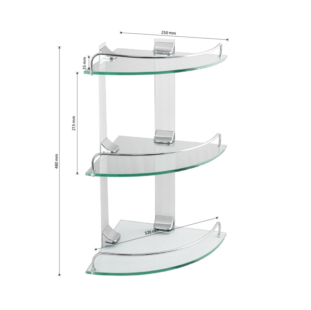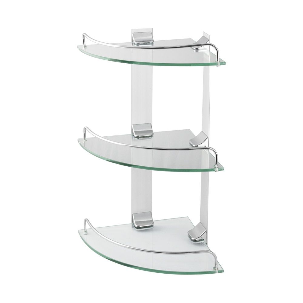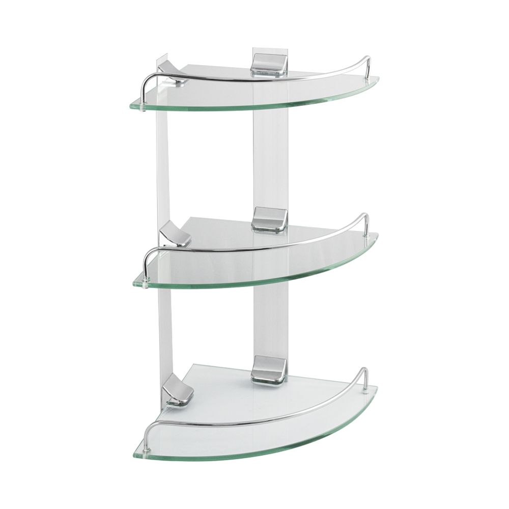 Подвесная трёхэтажная угловая полка для ванной из прочного стекла, толщиной 5 мм с полированными краями о которые невозможно порезаться, с надежной фиксацией к стене с помощью крепления из металла с хромированным покрытием