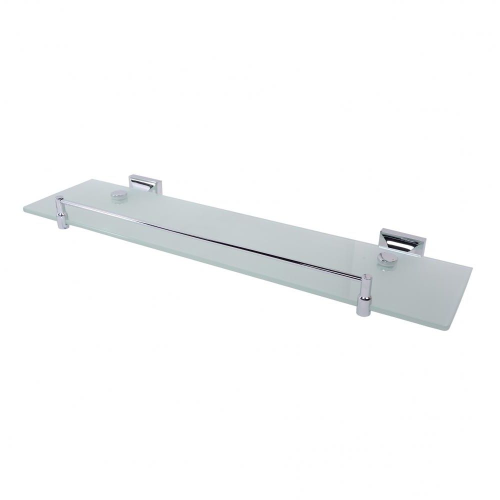 Полка в ванную комнату прямоугольной формы изготовлена из матового стекла. Держатели и бортик изготовлены из металла, покрытие хром.