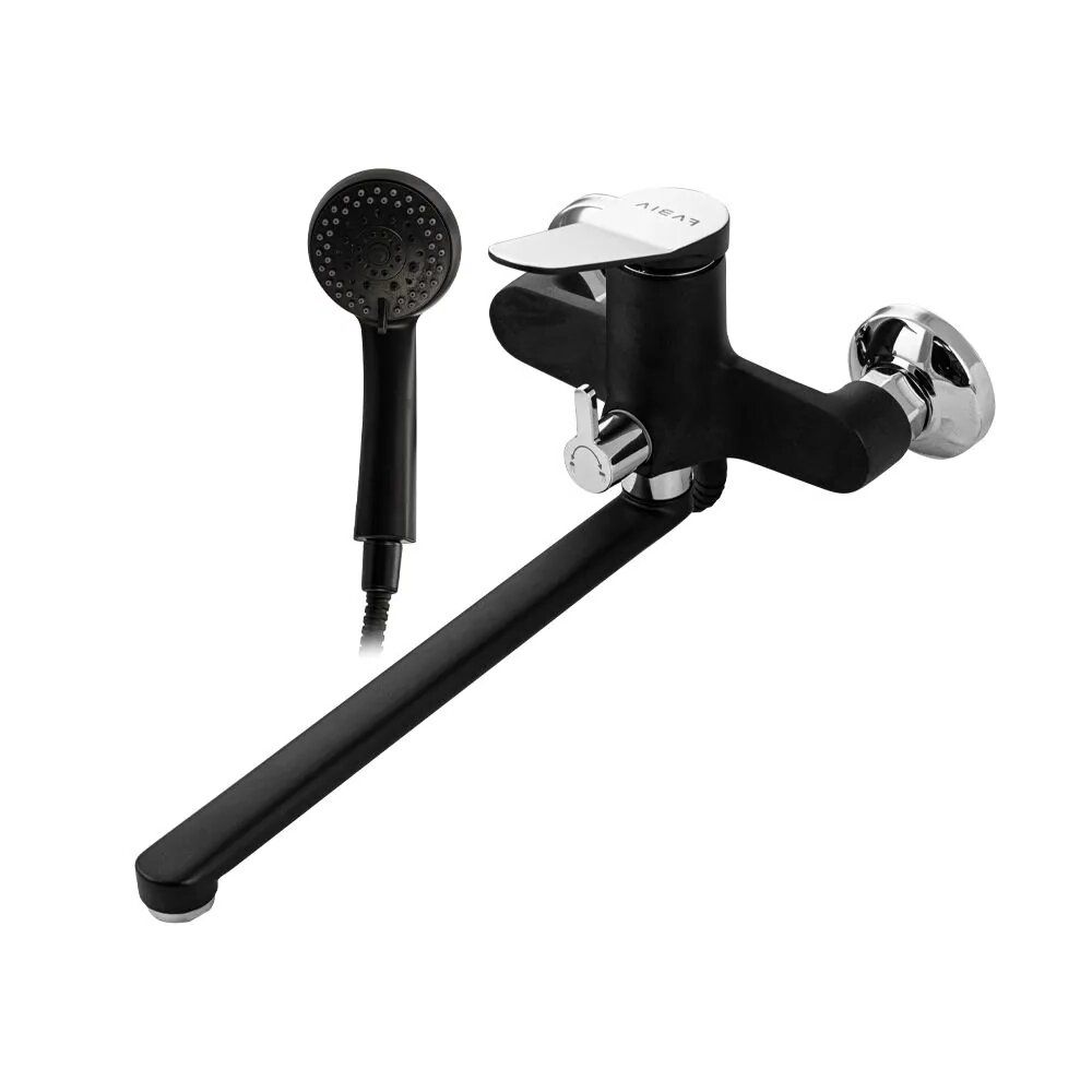 Смеситель хромированный с покрытием черная эмаль в ванную / душевую комнату с длинным, плоским изливом, тяжёлый, массивный корпус, шаровый, с дивертором м/к на корпусе.