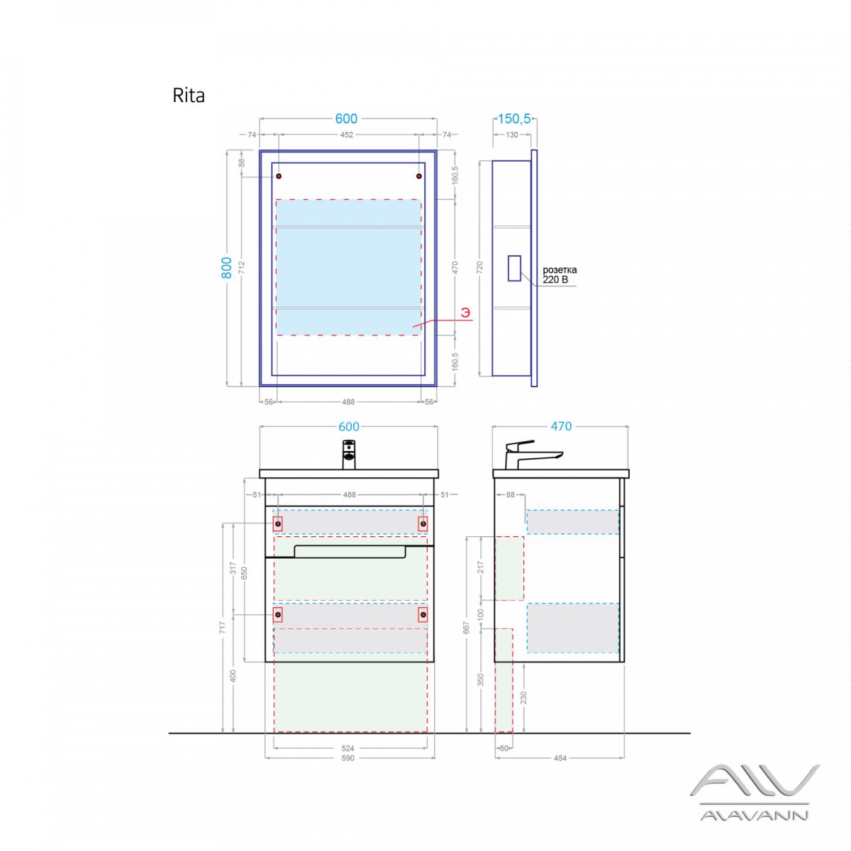 Тумба с раковиной ALAVANN RITA подвесная 600*670*470мм