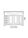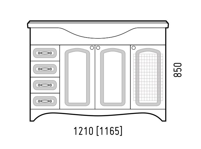 Тумба оснащена четырьмя выдвижными ящиками слева, две дверцы посередине, позади полка, справа корзиной для белья справа.