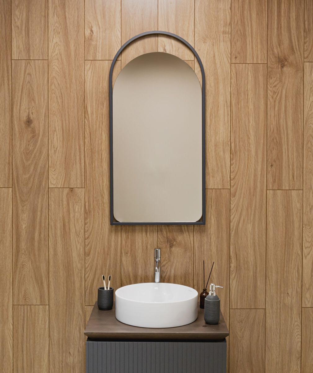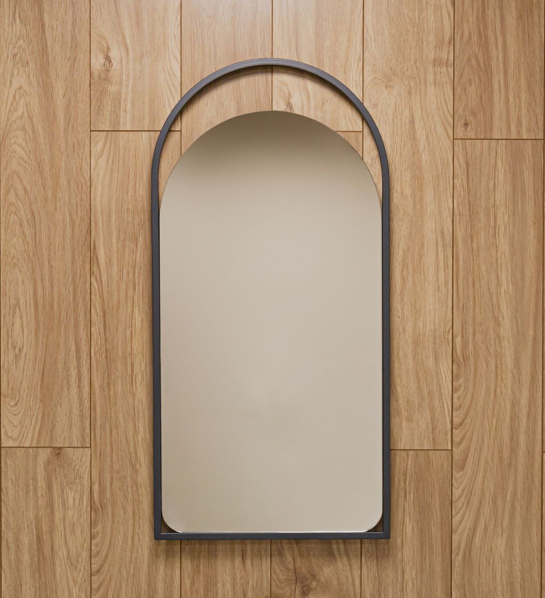 Это зеркало арочной формы соединяет в себе сразу два тренда — на «мягкую» геометрию и металлическое обрамление.